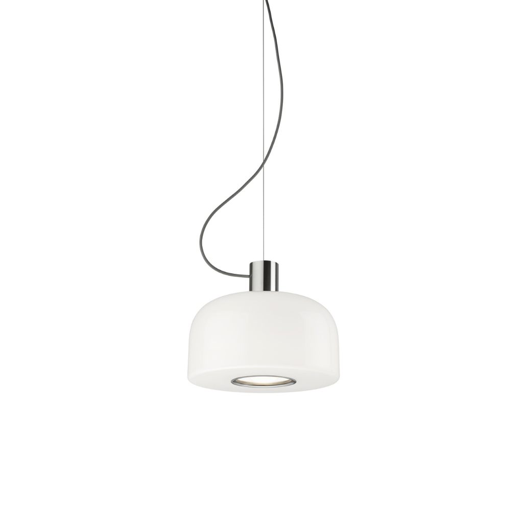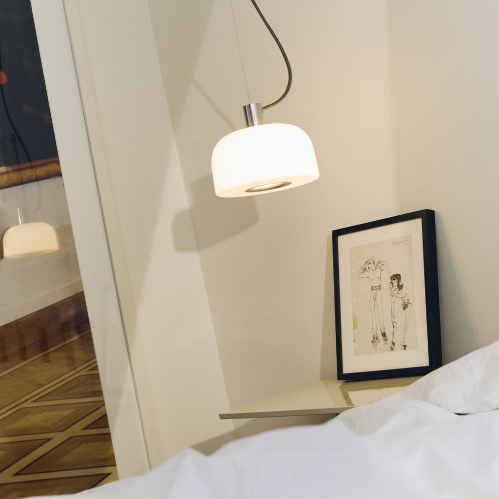 BELLHOP GLASSは、シリーズの象徴であるベル型シェードを受け継ぎながら、吹きガラスによる3層構造シェードを採用したモデルです。光はガラスを通して全方向へ均一に広がり、空間全体を包み込むような、やわらかく心地よい明るさを生み出します。
