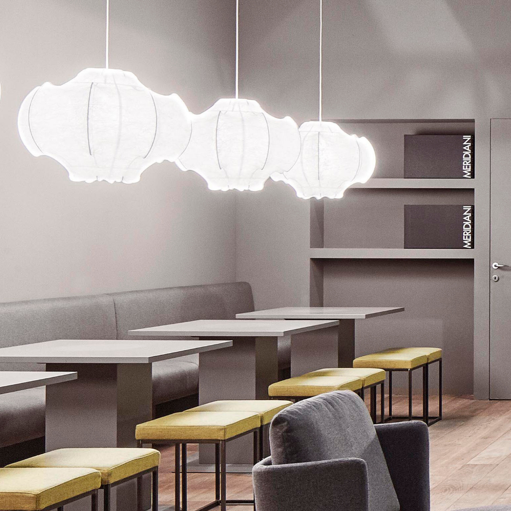細いワイヤーで軽やかに吊られた有機的なフォルムは、まるで空中に浮かぶ彫刻のよう。 しっかりとした存在感がありながらも、視界を遮らず、空間にすっと溶け込む不思議な軽やかさがあります。