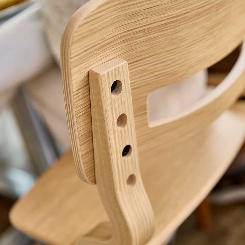 人気のハイチェアが進化。 デザイン刷新で座り心地が良くなっただけでなく、高級感漂う「オーク材」も仲間入り。より快適で、贅沢な一台へ。