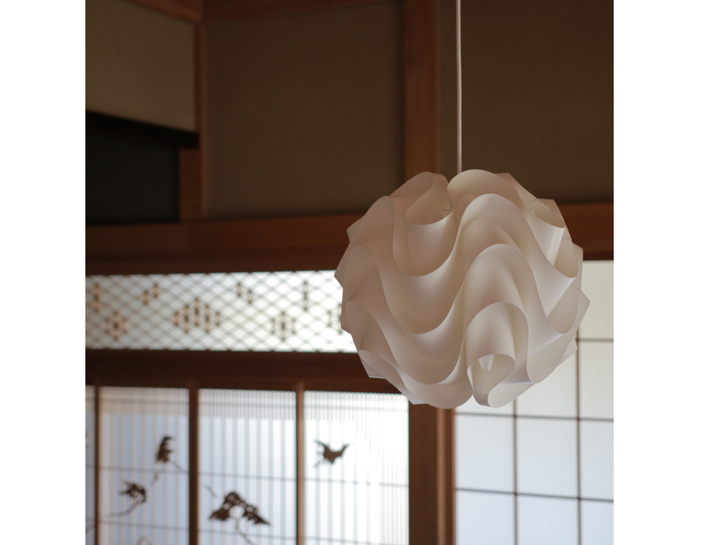 Mサイズは長方形テーブルなら150cm前後、丸テーブルなら直径120cm程度にちょうどよく、Lサイズは180cmまでの長方形テーブルにおすすめです。やわらかな光と波打つフォルムが、落ち着いた印象と静かな存在感をもたらしてくれます。