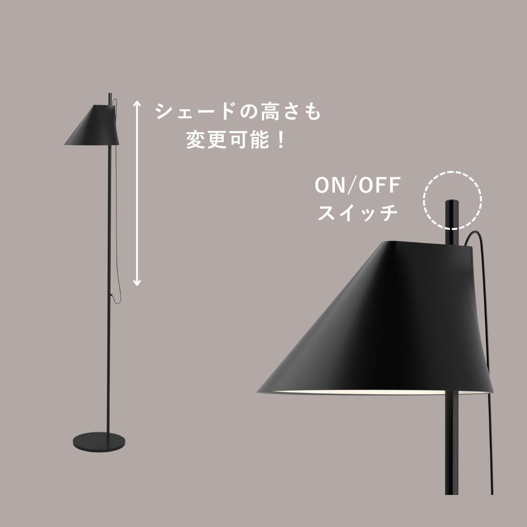 ON/OFFスイッチは支柱のトップに配置され、立ったままでも座ったままでも、スムーズに操作できます。シェードは上下に可動し、必要な場所に灯りを届けることが可能です。Yuh フロアは、北欧インテリアに自然と馴染むデザインと、タスクライトとしての確かな実用性を兼ね備えた、スタッフおすすめの一灯です。
