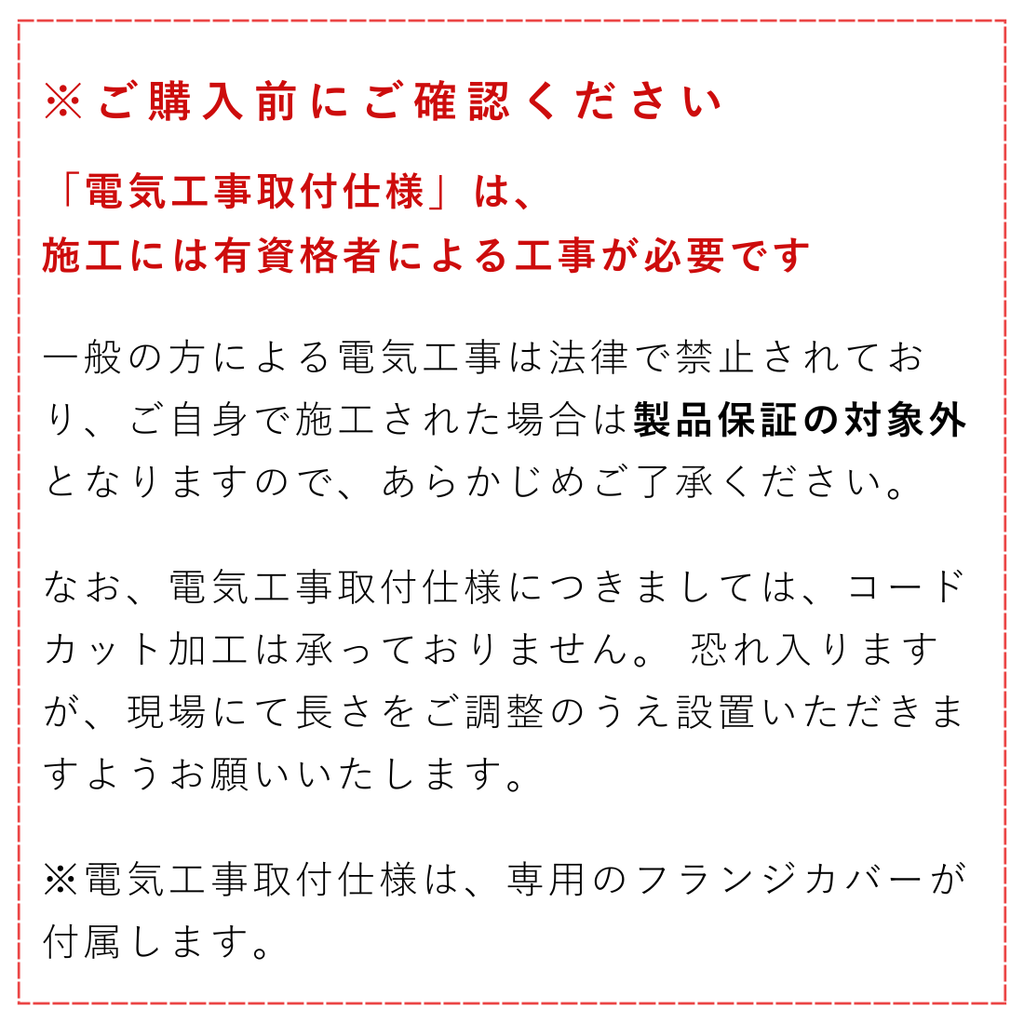 なお、電気工事取付仕様につきましては、コードカット加工は承っておりません。恐れ入りますが、現場にて長さをご調整のうえ設置いただきますようお願いいたします。