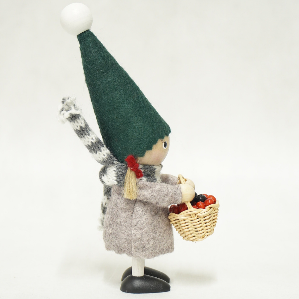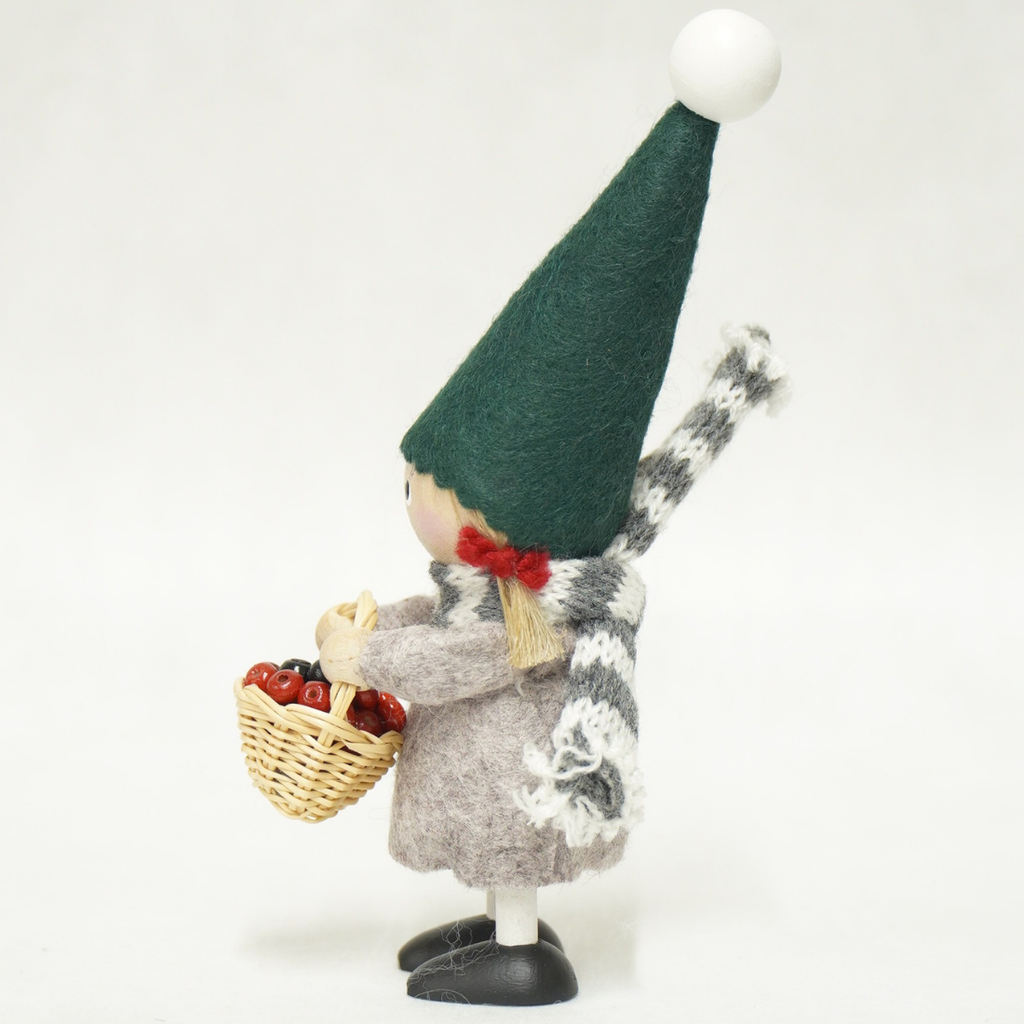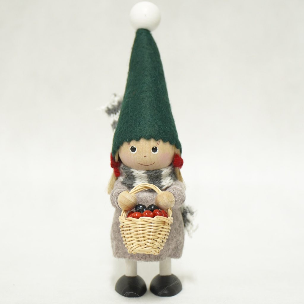 森に入って、小さなカゴを手にベリーを摘む女の子のニッセ。北欧ではベリー摘みは季節の楽しみのひとつ。小さな手で一粒ずつ集める姿は、なんとも愛らしく心を和ませてくれます。