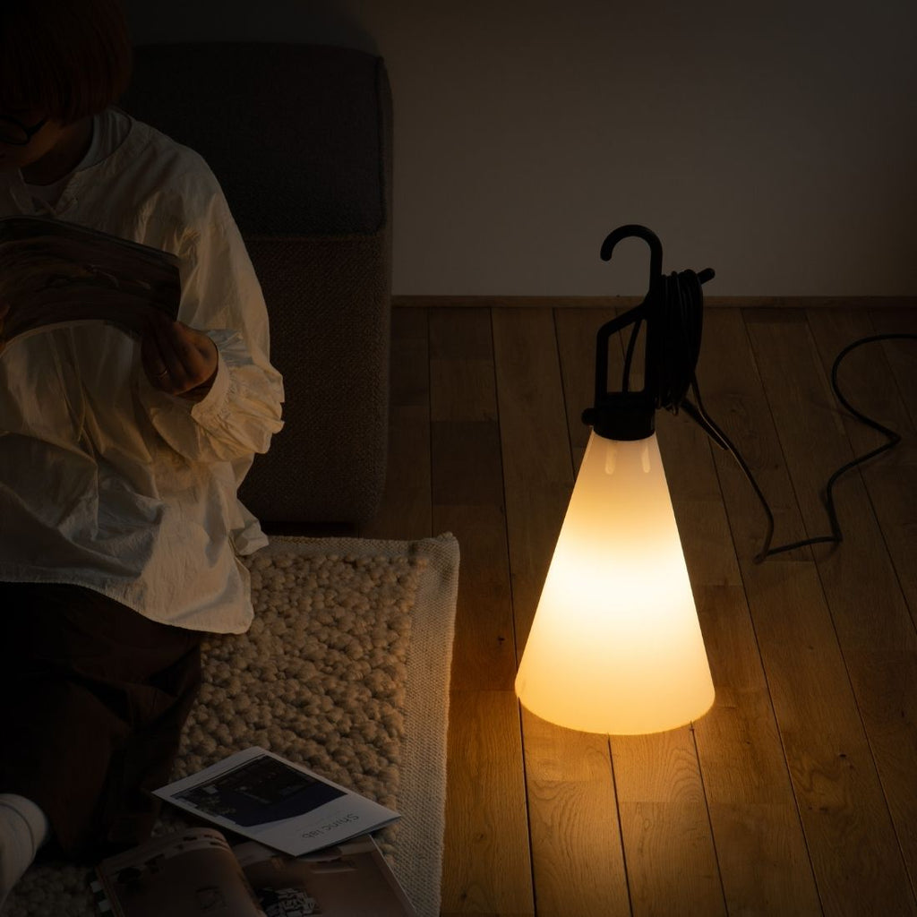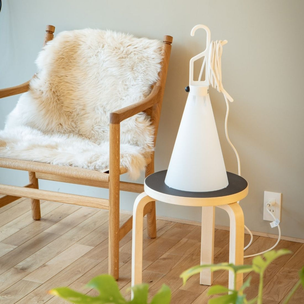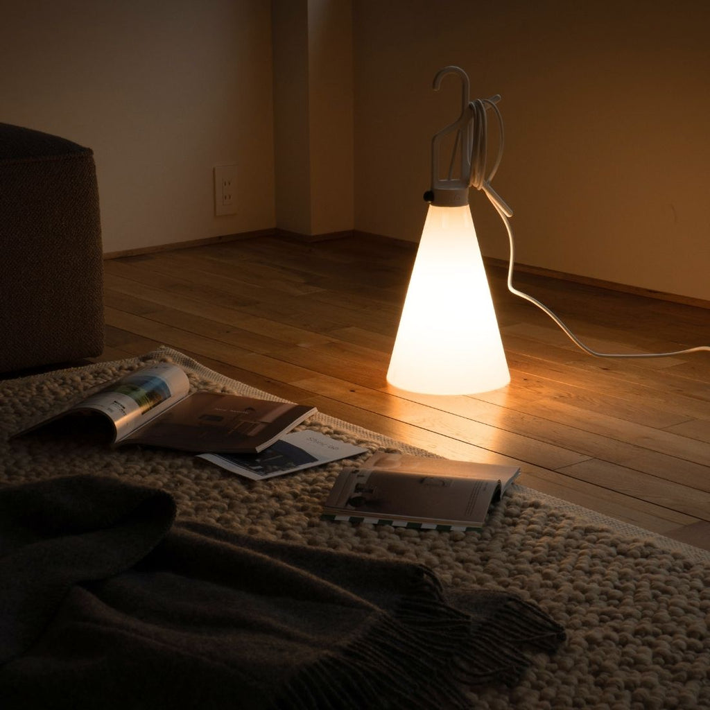 MAYDAYの特徴のひとつが、ふんわりと光を広げる乳白色のシェード。眩しすぎず、でもしっかりと明るさを感じられるやさしい光は、お部屋全体に心地よい空気を生み出してくれます。床に置いたときの光のひだまりも、どこか幻想的な雰囲気を演出してくれます。
