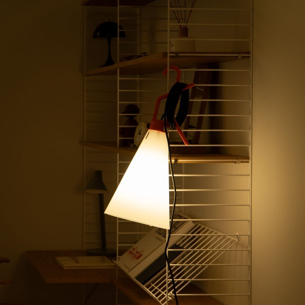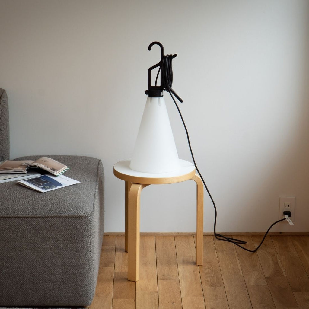 取っ手付きのユニークなフォルムと、どこにでも掛けられるフック構造。床に置いても吊るしても、カーテンレールに引っ掛けてもOK。まさに照明の常識をくつがえす一台です。